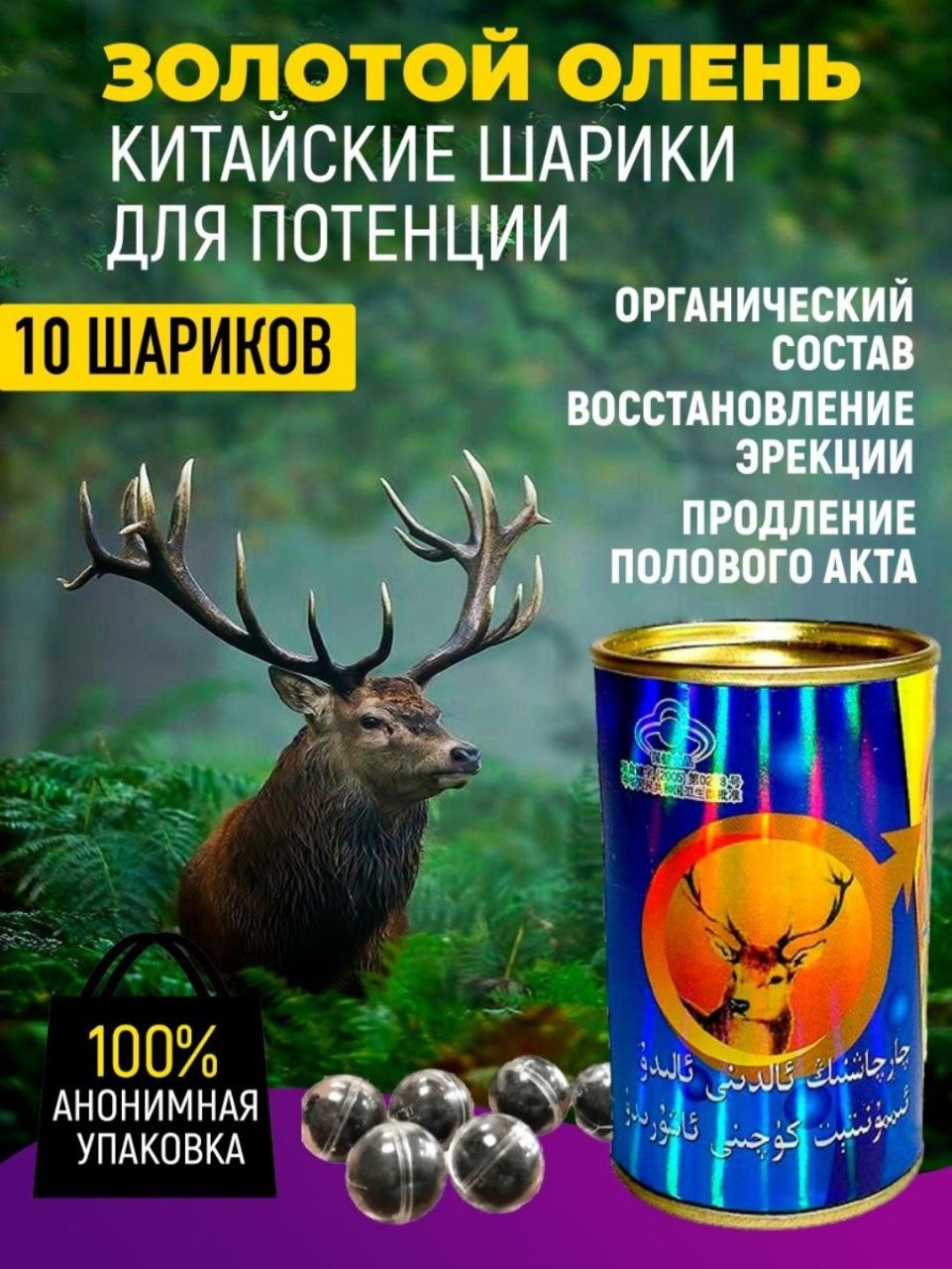 Китайцы с древних времен почитают оленей. Это животное олицетворяется у них с благополучием и долголетием – не зря именно олень часто сопутствует древнекитайскому богу долголетия Шоу Сину. Если вы решите купить китайский натуральный препарат в шариках Золотой олень, то тоже сделаете шаг навстречу долголетию, причем не только к обычному, но и к сексуальному.